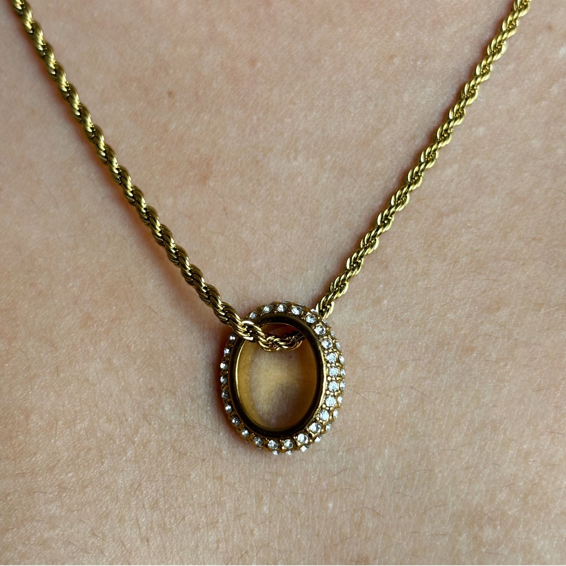 This neckpiece features a sleek twisted chain with a ring-shaped pendant, fully studded with Cubic Zirconia (diamond simulant)for an elegant look. Perfect for adding a hint of glamour to any outfit, this design effortlessly blends sophistication with simplicity.