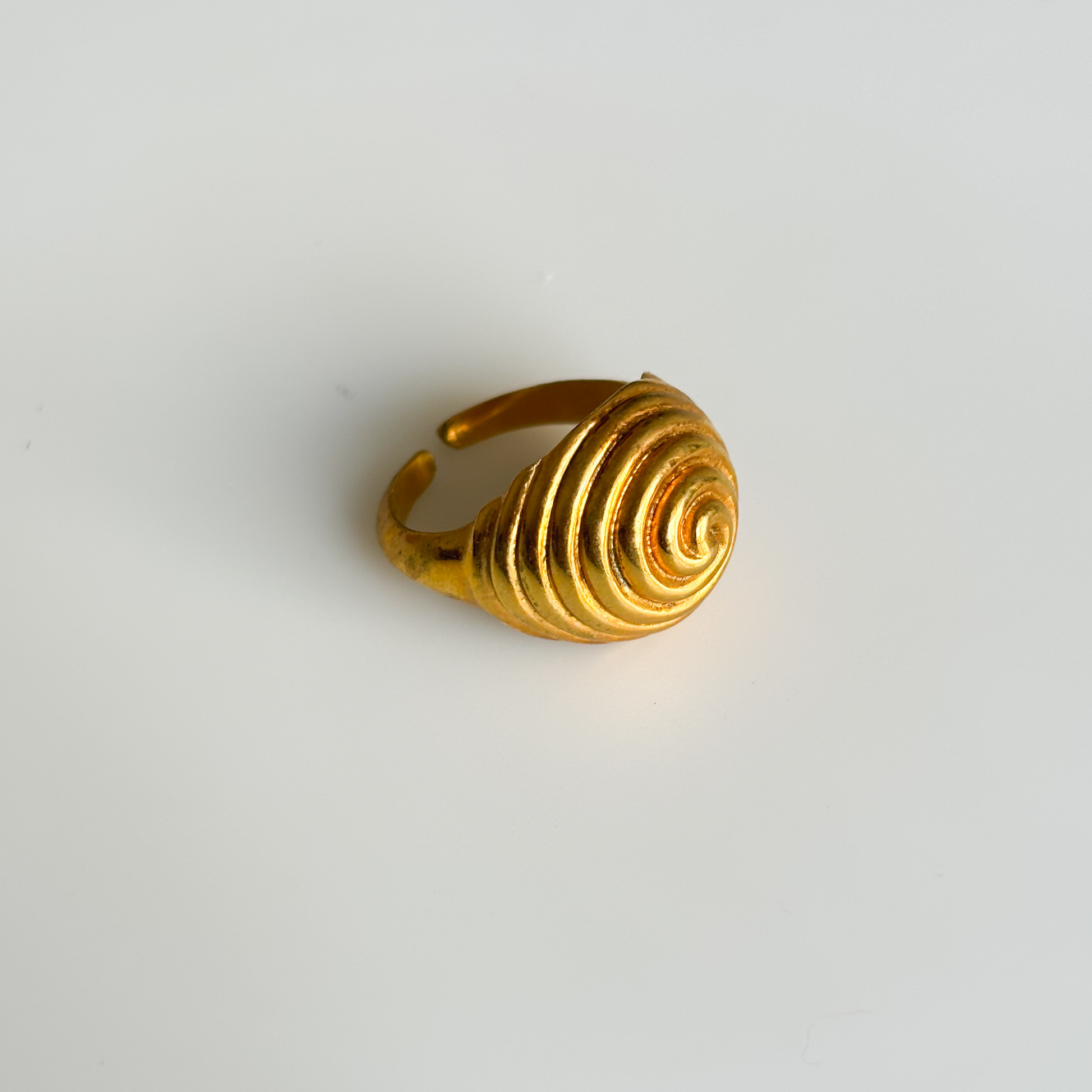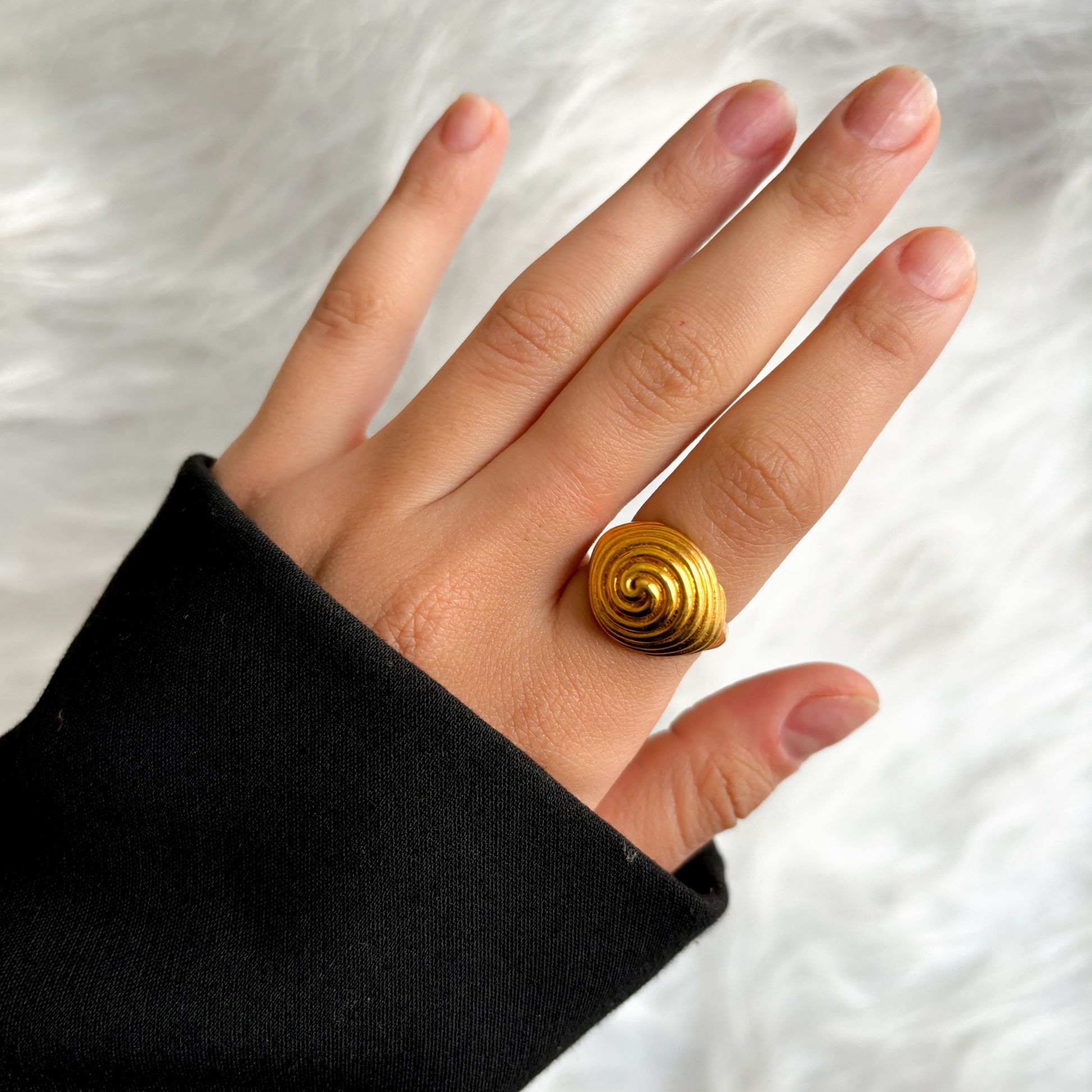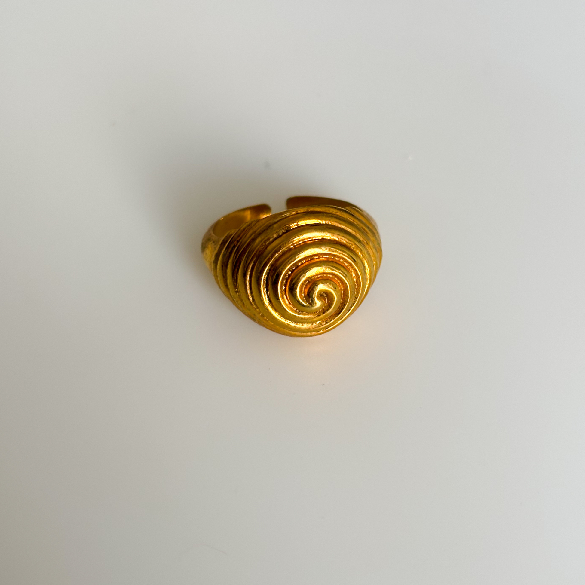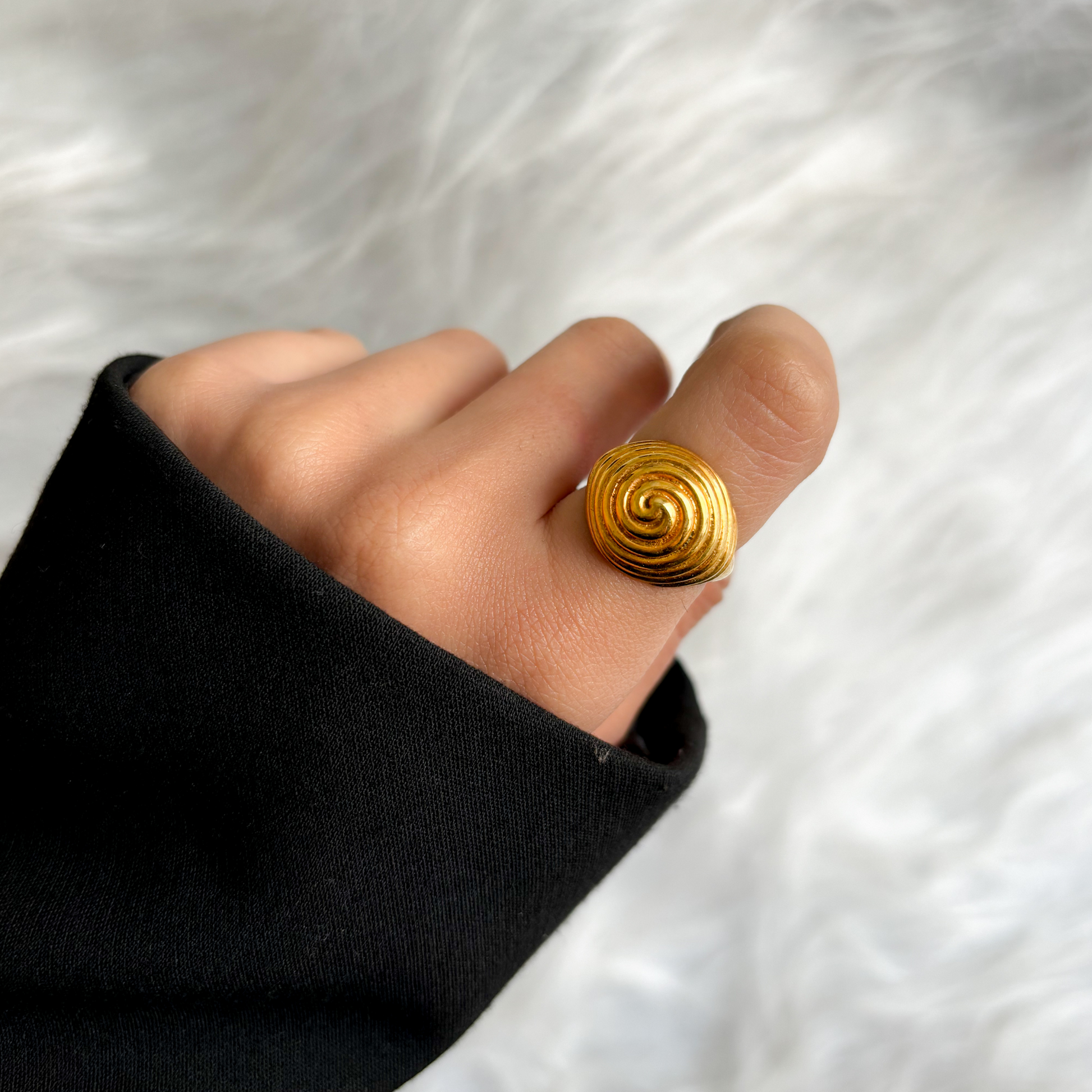The Spiral Dome Ring features a bold, bulging dome design with an intricate spiral pattern, creating a striking, sculptural look. Its unique shape adds a modern and dynamic touch to any outfit.